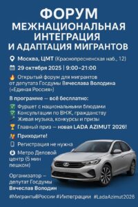 29 октября 2025 года в Центре международной торговли (ЦМТ) на Краснопресненской набережной, 12, состоится открытый форум «Межнациональная интеграция и адаптация мигрантов». Мероприятие организовано по инициативе депутата Государственной Думы Вячеслава Володина (фракция «Единая Россия»).