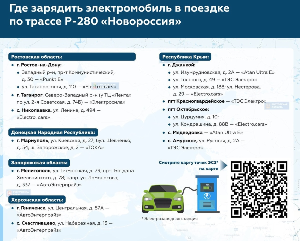Полный список зарядных станций на трассе Р-280 «Новороссия»: